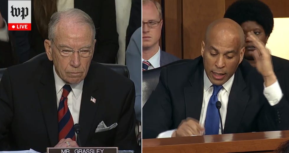 OK, so Chuck Grassley started saying "good morning, let's poop on America together," and immediately Kamala Harris (D-She's Running) started interrupting to say "fuck this shit, we haven't even read those documents from last night and neither have you" and she kept yelling and then Dick Blumenthal was like "YEAH WHAT KAMALA SAID" and Cory Booker is like "ADJOURN, THIS MEETING IS ADJOURNED" and then there was a protester who screamed some stuff and this shit is LIT.