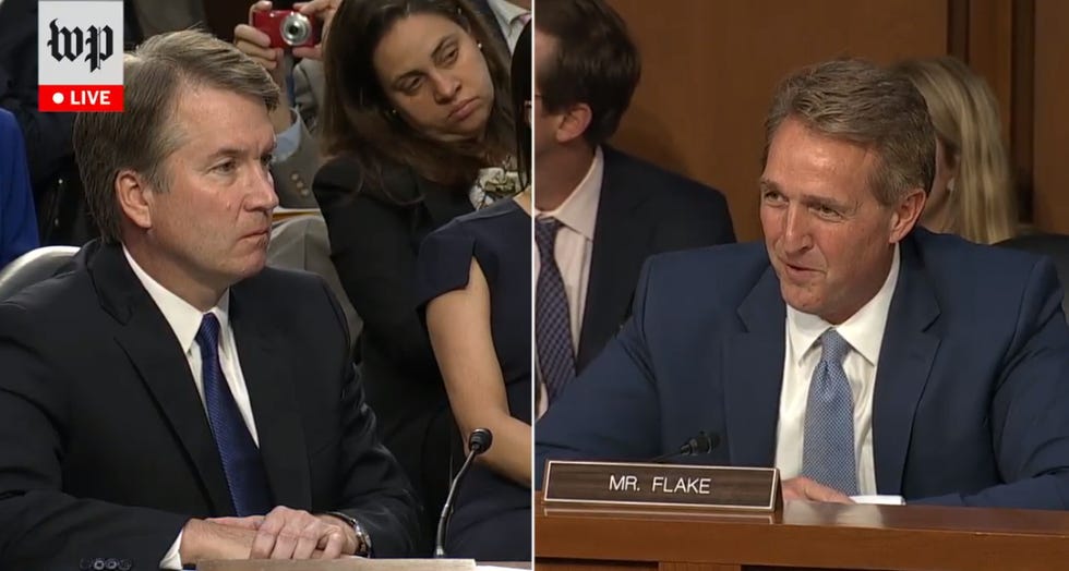 Jeff Flake says Brett Kavanaugh should be on the Supreme Court because he likes football and ran some marathons and has daughters and also the other moms and dads on Kavanaugh's youth sports teams say he's just great. Told you it was gonna be a public rimjob.