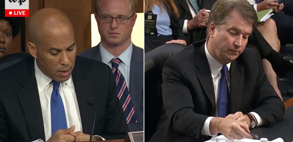 BOOKER: Dunno, you'll have to ask these other Democrats to find out if they're in the mood to let you make an opening statement anytime before the midterm elections. But seriously, we have only gotten 10% of the documents we need, and we are not even sure if Brett Kavanaugh can't fall asleep at night without playing big spoon/little spoon with an American Girl doll, which is why we need to see those documents.