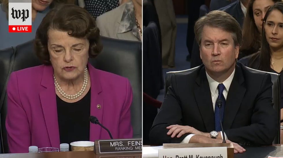 Now Feinstein is just cold listing off problematic things about Brett Kavanaugh, as a way to explain why we need to be able to read all these documents so we know exactly how bad he is before we do anything dumb like confirm this dumb idiot.