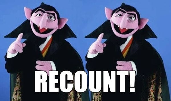 Even as Kemp prepares to shove his way into the governor's mansion, Stacey Abrams insisted on a full accounting of outstanding absentee and provisional ballots. A recount could be triggered if Kemp's lead dipped below 50 percent of the total. As of Thursday morning, another 25,632 Abrams votes would be needed to tilt that percentage into a recount. Kemp claims it's mathematically impossible for enough ballots to surface for that to happen, but Abrams, ever the troublemaker, insists on a full accounting of what ballots are out there, not a general dismissal, please.