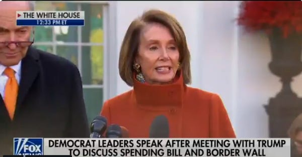 During the meeting, Trump interrupted Pelosi a whole lot, and she responded by not giving a fuck and making fun of him to his face about how all she does is win, while Trump was left to whine about how nobody ever talks about how "he" won the Senate for the GOP. (The Senate election schedule, which heavily favored Republicans in the 2018 midterms, won the Senate for the GOP.)