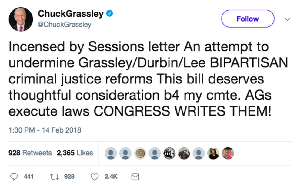 The trouble all started in October when Grassley, known bleeding-heart liberal, sponsored the Sentencing Reform and Corrections Act to shrink the federal prison population, eliminate "three strikes" life sentence requirements, reduce mandatory minimums for non-violent drug crimes, and increase judicial discretion. It would also retroactively reduce sentences for people who got extra time for crimes involving crack (as opposed to powder) cocaine. Which all seems very reasonable, unless you are a demented little leprechaun who sees REEFER MADNESS MS-13 around every corner. Jeff Sessions will protect Real Americans from those THUGS who rape our precious white women!