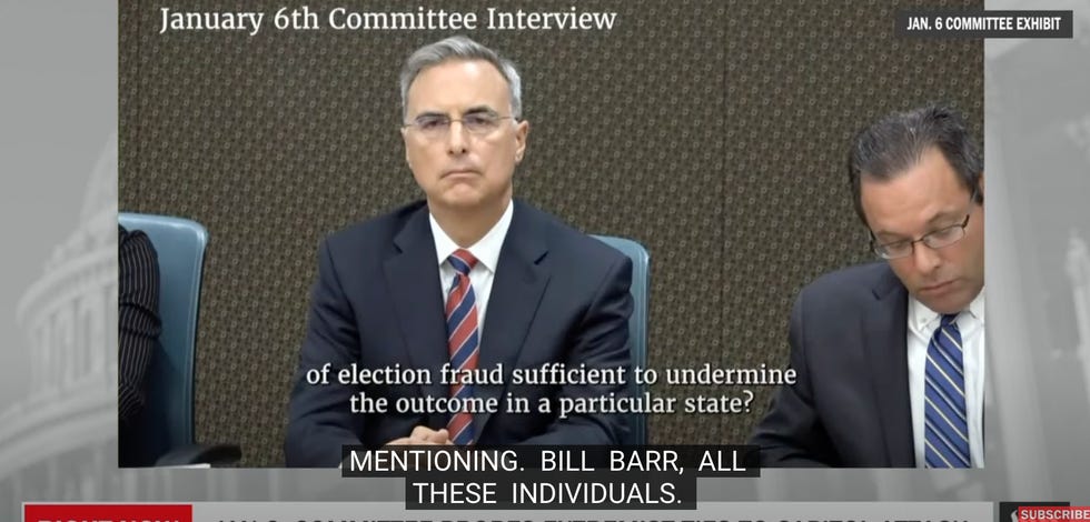 3: 00Ah, shit, we're getting the video of Bannon on January 5 promising that "all hell is going to break loose tomorrow." Bannon's lawyers have been screaming bloody murder that he can't get a fair trail next week because of publicity from the committee. Judge Nichols said no to a postponement yesterday, but Bannon's lawyers are 100 percent going to try again on the basis of this brief mention.