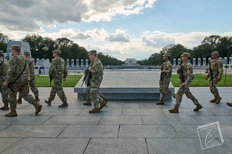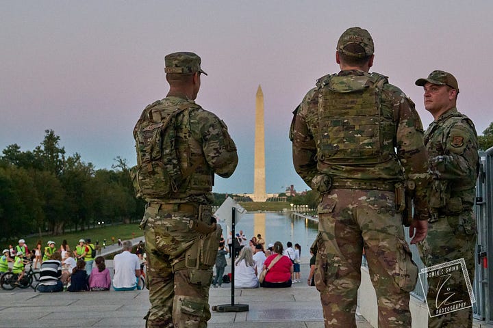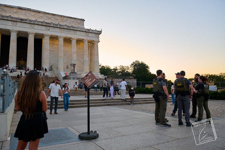 It’s 5 p.m. and there are National Guard soldiers walking around the Lincoln Memorial right now. Sitting on the steps, I’m watching them pace back and forth in front of the Reflecting Pool.