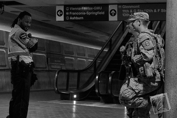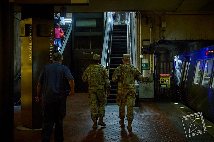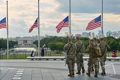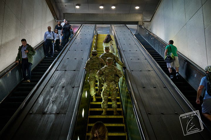 Most of the Guardsmen are very young. I’ve traded old jokes with some of the friendlier guys about staying hydrated and avoiding mosquitoes. Some complain of being tired, and hoping they get time to explore the city on an e-bike or a scooter. They’re supposed to be here through Mid-September, but the president (allegedly) has the authority to extend that order.