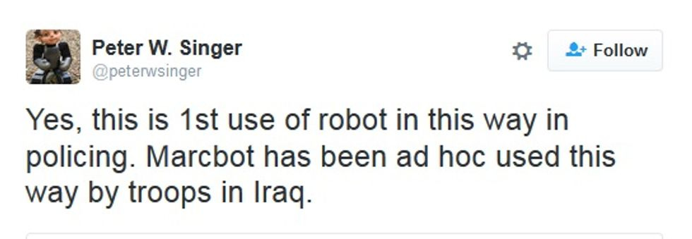 Singer added in a tweet that while this is the first use of a robot to deliver an explosive by police, it's not an absolute first in the world: