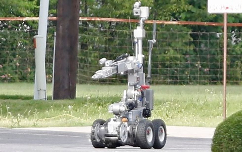 In June 2015, Dallas police used a robot to access an armored van used in an armed lunatic's attack on police headquarters, fearing the vehicle might have been rigged with explosives. Robots are sometimes equipped with a shotgun attachment, used to detonate bombs or shoot through doors, but this is something new, and as far as we can tell, more an on-site improvisation than anything the Dallas PD had planned out as a contingency (that's speculation -- if we learn otherwise, we'll update). The Atlantic talked to some experts on this sort of thing: