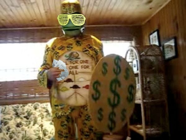 Okay, so it wasn't that hard to find the video of "W. McSpeedy." But we swear he providedno link whatsoeverin his email pitch encouraging us to watch his mysterious video. Here is your strange character, trapped in a small wooden cage, wearing a Darth Vader helmet covered in dollar signs, and yellow pajamas which are also covered in dollar signs, and holding a cardboard circle which is, of course, also covered in dollar signs. HE'S A TURTLE.