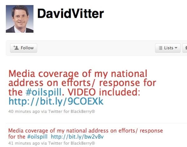 David Vitter is furiously twatting about how he gave the GOP national radio address this weekend and how everyone covered it and how everyone should watch and listen to him talk about the oil spill all the time. Here is what he said, by the way, in his address: "'That’s why it’s so frustrating to many Louisianans that while the crisis actually continues in the Gulf – while we’re still fighting to contain the well – Washington Democratic Committee Chairmen have rushed to create media events for television cameras instead of devoting full attention to stopping the immediate problem,' Vitter said." Yeah, those shameless Washington Democratic Committee Chairmen! David Vitter would never talk to the media during such a crisis. [ Twitter , The Hill ]