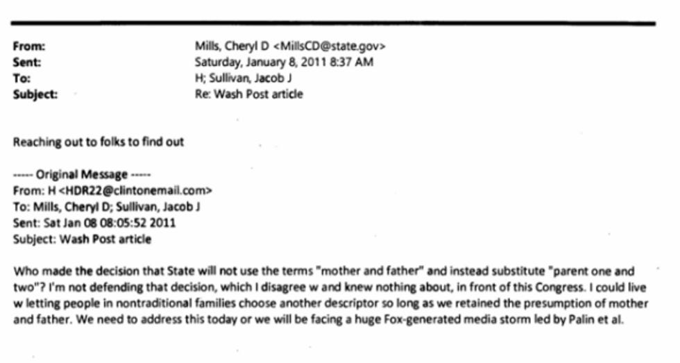 Did everybody hear the news?! All the journalists have heard the news, of course, that there are MOAR HILLARY EMAILS!!!!11! for everybody to obsessively finger through like a Duggar in his sisters' bedroom. And one of the (!!!) revelations is that, in 2011, Hillary Clinton sent an email about a proposed change on passport forms that would substitute "parent 1" and "parent 2" in place of the traditional "mother" and "father." And DRUDGE SIREN, Hillary was against it at the time, during President Obama's first term, 14 months before he and his administration came out in support of marriage equality, two years before DOMA was struck down, and four years before the Supreme court throat-crammed all the amber waves of grain and the purple mountains' majesty with hot, hard homosexbian marriage.