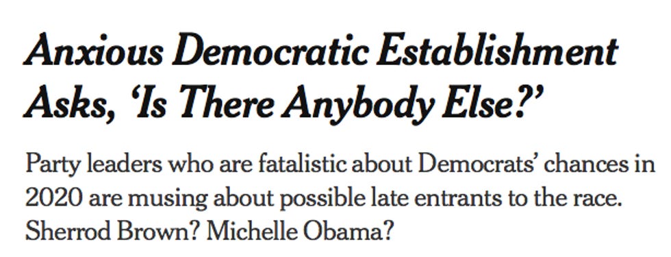 The "anxious" Democratic establishment reportedly thinks Elizabeth Warren isn't "viable" in a general election because she has actual policies. They're probably also more afraid of Bernie Sanders winning than losing. It doesn't bother them too much that fewer than 20,000 people have ever voted for Pete Buttigieg, but they are mildly concerned that it might be his top number among minority voters nationwide. They've found Biden's debate performances "lackluster" and they haven't even seen his latest town hall. They also don't see an alternative among the other 13 candidates running. I don't suggest taking another look at Marianne Williamson, Andrew Yang, Tulsi Gabbard, or Schrödinger's candidate Wayne Messam. But Kamala Harris, Julián Castro, Amy Klobuchar, Cory Booker, and even Michael Bennet are all reasonable options. The Democratic establishment is acting like my five year old: No, you don't need more toys. You have plenty already. Play with those. But the establishment doesn't just want "new" toys. It wants to dig up some old ones from the attic.