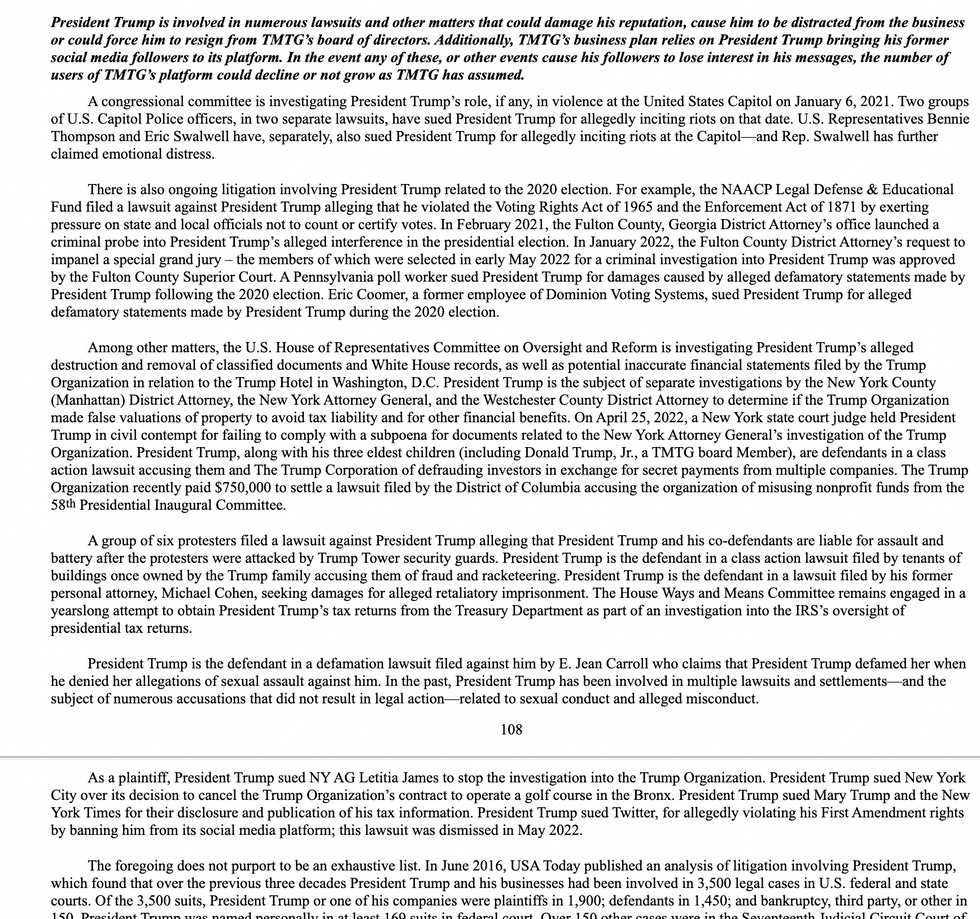 Here's the section on Trump's "numerous lawsuits and other matters that could damage his reputation, cause him to be distracted from the business or could force him to resign from TMTG’s board of directors":
