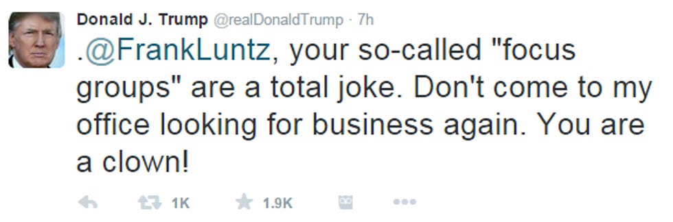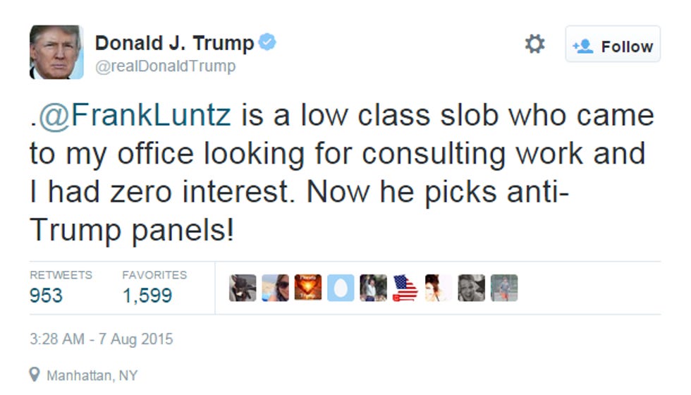 And finally, as we alluded to above, Trump is mad at Fox News pollster Frank Luntz, whose schtick is to get a bunch of homeschooled Republicans in a room and let them pick corn out of each others' poo while yelling, and boy howdy, Luntz's focus group of corn-pickers HATED Donald Trump: