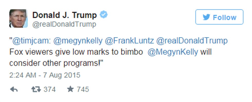 Right. Also, we guess he agrees with this one Twitter follower he has, who called Kelly a "bimbo," which is totally different from calling a lady a fat pig, so what's the problem?