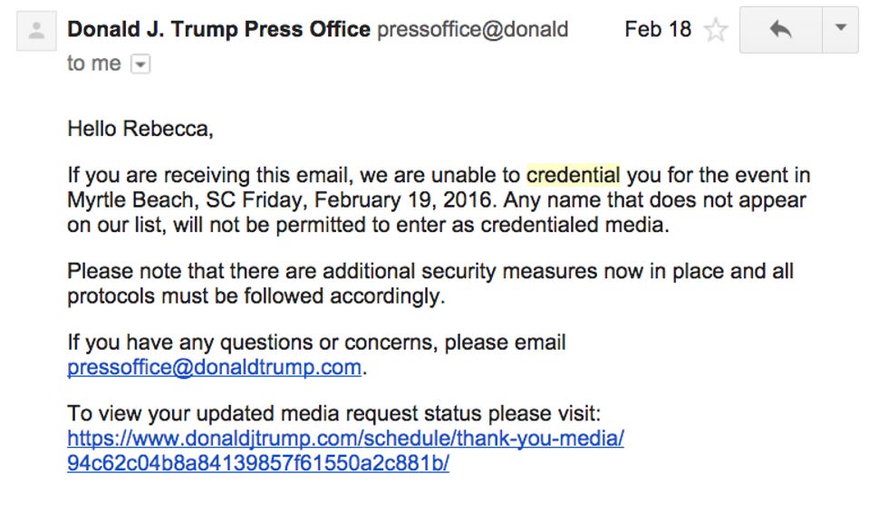 Okay, but the Trump campaign says it doesn't actually look into everyone who asks it for a credential, and that everyone who wanted to go to their Memphis rally got to go. (Hahahaha, weirdly, NOPE.) They are very free and easy and loosey-goosey and come one come one all open door for everyone, right?