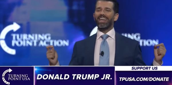 In that video, Junior explains, like a reject who has finally found a peer group that doesn't make fun of him for peeing his pants all the time, how excited he was to fly all the way out to talk to the Turning Point USA kids.