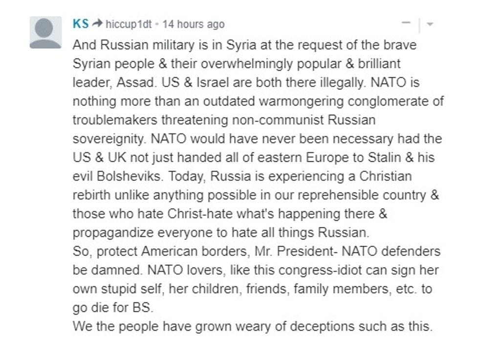 You can see that divide in the comments on virtually any Breitbart story on NATO, where the dipwards share Trump's view that Russia's not a problem and Western Europe is full of sissy freeloaders, so screw 'em. This peace-loving definitely-an-American has thoughts on who really loves peace, and it is Russia (and Syria), not NATO aggressors: