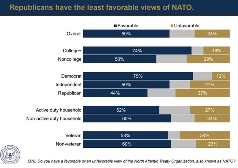 To complicate matters, polling from the "Ronald Reagan Center for Peace Through Strength" (vomit) suggests support for NATO is becoming weirdly partisan. Democrats and independents are far more likely to have favorable views of NATO, while Republicans are frequently Meh or opposed: