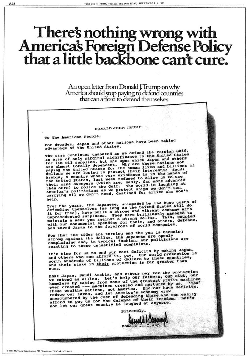 Yes, and don't get him started on aircraft carrier catapults, either. Trump prefers steampunk! Also, WaPo provides a nice look back at just how long Trump has believed other countries are ripping us off (for mere international stability). Back in 1987, he ran a full-page ad in the New York Times complaining that our allies need to pay the full cost of their own defense and stop playing the USA for suckers: