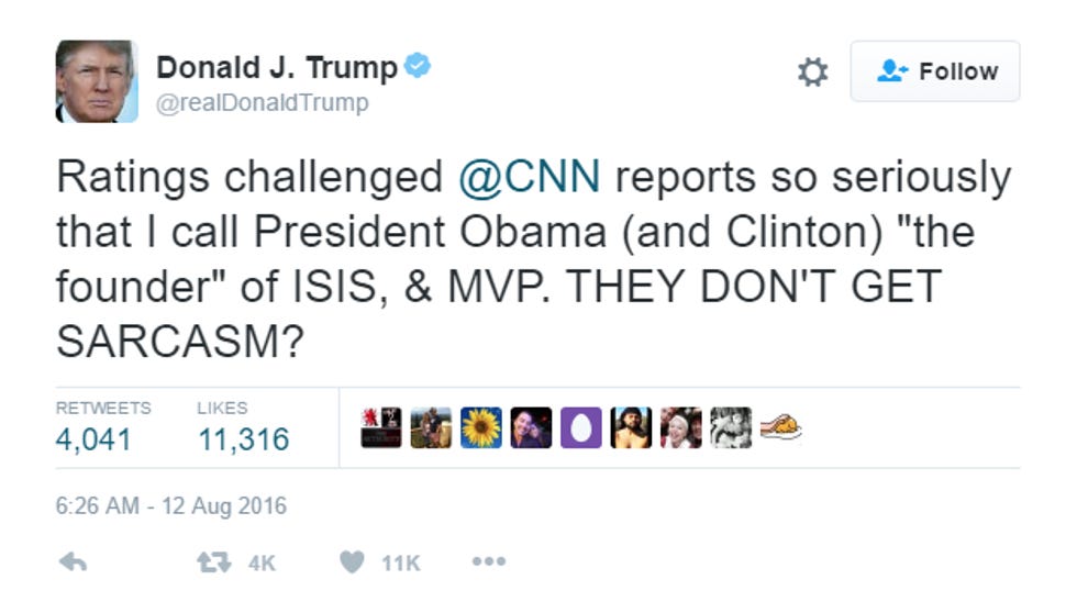 "Sarcasm." Uh huh yup, what a jokester that Donald Trump is, always surprising us with the punchline. Hey Trump: Leave the jokes to Wonket. You stick to ... being a sad fraud who builds ugly buildings with other people's money, or whatever your "specialty" is.