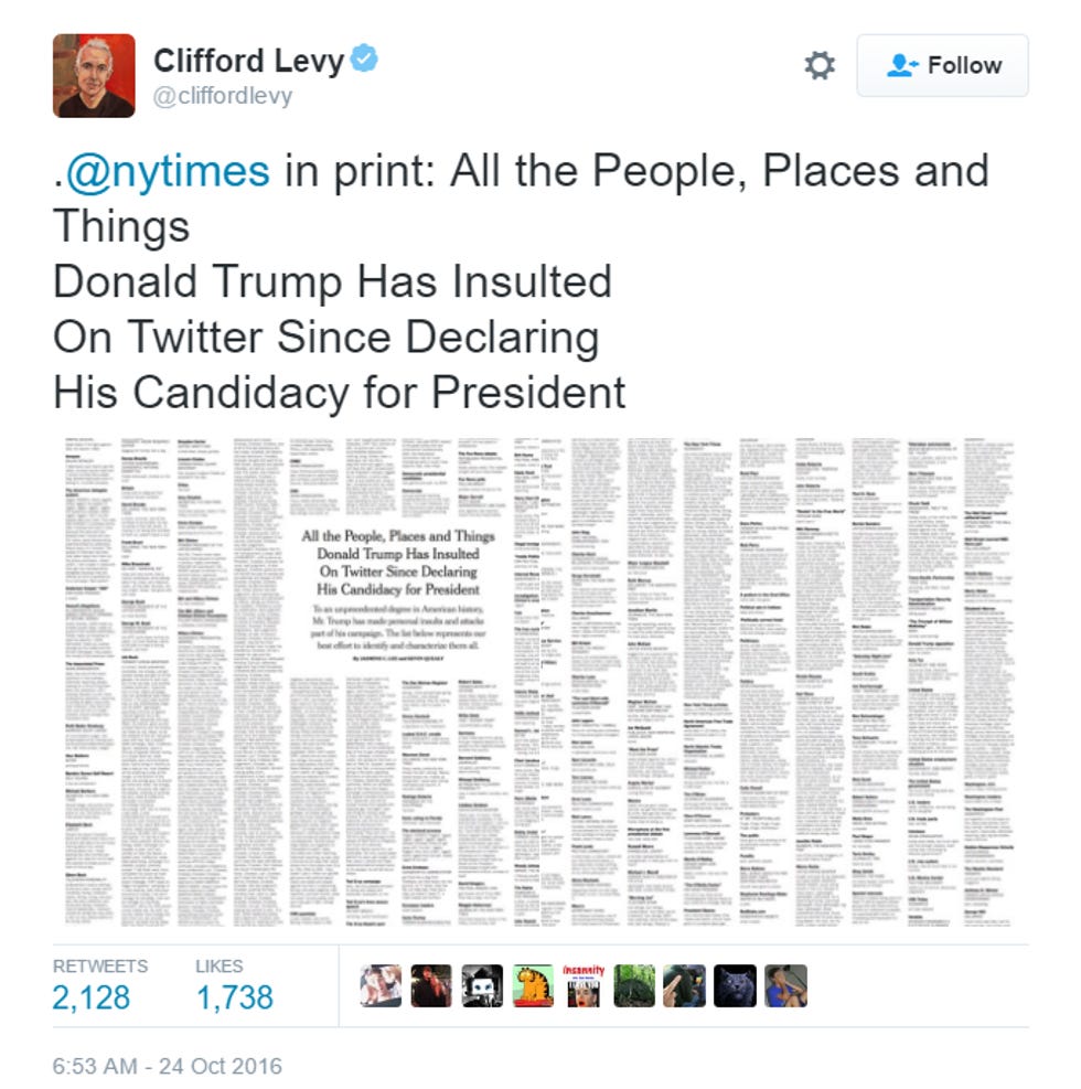 Anyway, in the print edition, it covers TWO WHOLE PAGES. That mean Mexican billionaire Carlos Slim -- who has got to be feeling so strange, knowing that for no particular reason, Donald Trump is terrified of him -- is teasing Trump again! You can click here to read through it yourself, as it is exhaustive . Not only does it feature all the times Trump has insulted Hillary Clinton on Twitter, but it also includes other fun things, like when he cries about reporters and insults microphones that make him sound like a coke addict. Microphones is #RIGGED!