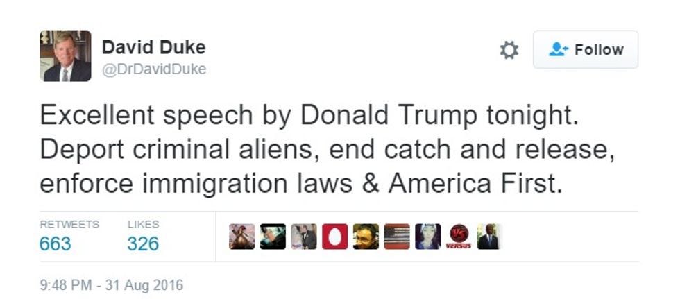 Believe it or not, kids, this was a teleprompter speech. Trump has gotten a lot better at using a prompter, and while we wouldn't say he sounds natural reading from one, he now sounds almost exactly as unnatural with one as without. Here we should note, per WaPo's annotation of the speech, when Trump spoke in Phoenix in July 2015, he said, "I don’t use teleprompters like the president and I speak from the heart." He also said this wouldn't be a "rally speech," but instead would be a "detailed policy address." It did have some policy in it, but above all, it was a red-meat anti-immigrant speech, a nativist throwback to the style of his primary campaign. How good a speech was it? This good: David Duke positively loved it.