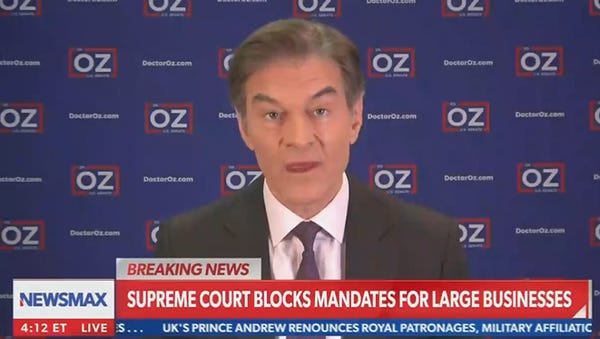 Oz wants Dr. Fauci to DEBATE MEE!1!1!!1 about vaccine mandates and natural immunity and therapeutics and whatever else. "I think Dr. Fauci is basically the J. Edgar Hoover of public health, he's a petty tyrant!"