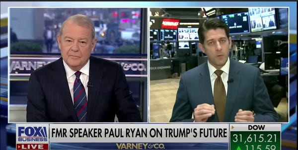 Former House Speaker Paul Ryan rolled over repeatedly for Donald Trump before quitting politics altogether in 2018. Since then, he's occasionally emerged from the corporate shadows at Fox News to offer objectively incorrect observations. His latest is that Trump won't be the Republican presidential nominee in 2024 and he won't support him when that inevitably occurs.