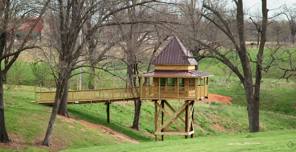 The treehouse that is not really a treehouse has a fucking vaulted ceiling and double-hung windows.