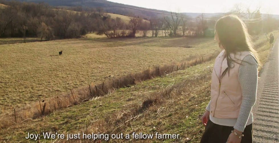 The ladies see an unpenned cow and decide to stop and put it back in its pen. Cue footage of them all running around to try to recapture this cow. The thing hops back into its pen of its own volition, but they roundly congratulate themselves nonetheless.