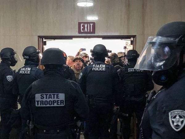 To prove they love liberty, members of the crowd broke glass doors at the Capitol, tried to crowd inside, and twice sprayed chemical agents at state troopers and Salem police inside the Capitol. For good measure, they assaulted some journalists covering the protests, because the Constitution is all about shoving nosy reporters around, especially if they take photos of you while busting glass in a state capitol building. The Tree of Liberty, after all, must be refreshed from time to time with broken glass.