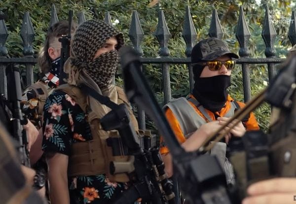 Well heck, sending a bunch of armed loonies to protest the arrest of another violent loony is clearly protected by the First Amendment, so why is the FBI suggesting that's the least bit untoward? To be fair, the report does note that, short of specific threats or violent actions, many of the activities it chronicles are indeed protected by the First Amendment — but that they also "indicate a propensity toward violence and acquiring weapons that cause mass casualties, used by a small number of attackers." It also notes that several boogalooers have "conducted violent attacks, showing the boogaloo concept attracts lone actors." The large presence of boogalooers at protests against masks and police violence, and the loose organizational structure of the movement, are also factors that are "favorabletosuchloneactoractivity."
