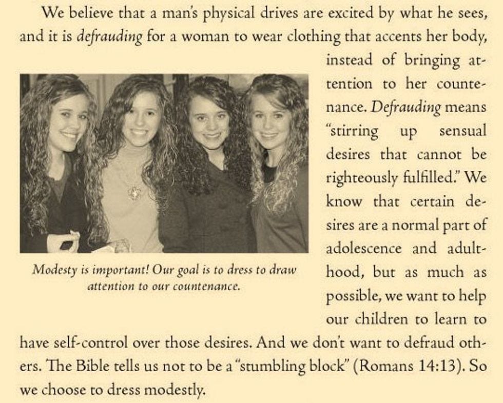 Boing Boing posted a page from the Duggars' 2011 book A Love That Multiplies: An Up-Close View Of How They Make It Work , which shows just how much we are not kidding about how, in the Duggar worldview, you ladies really need to stop tempting the men to diddle you, by merely existing:
