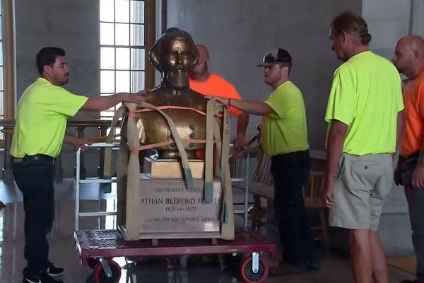 Yet another monument to treason and enslavement came down today, and it was a significant one: Tennessee legislators and visitors to the state Capitol in Nashville can now go about their business without walking past the bust of slave trader, Confederate general, war criminal, and early Ku Klux Klan leader Nathan Bedford Forrest. The bust was hardly a precious part of state history, having only been placed in the Capitol in 1978; the Capitol itself dates back to shortly before the Civil War.