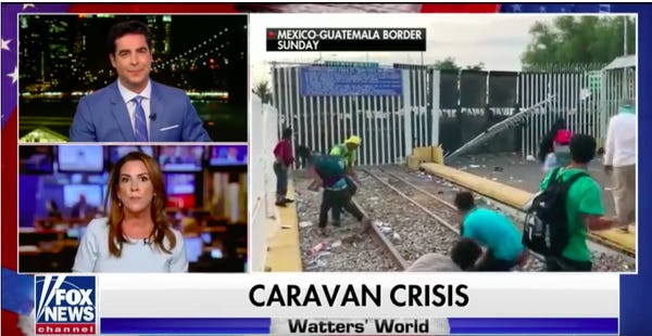 Wow, that's really depressing and would arouse the empathy of even one of those human resembling sci-fi androids that lack emotion processors. Speaking of which, Fox News correspondent Sara Carter turned up on Jesse Watters's show a few days before the election to discuss her "firsthand" experience with caravan members and the "criminal element" among them. I think she'd take the stairs before sharing an elevator with me, but sure, she totally spoke freely with MS-13 gang members she recognized on sight because they all wear easily identifiable thematic outfits like the villains' henchmen on "Batman."