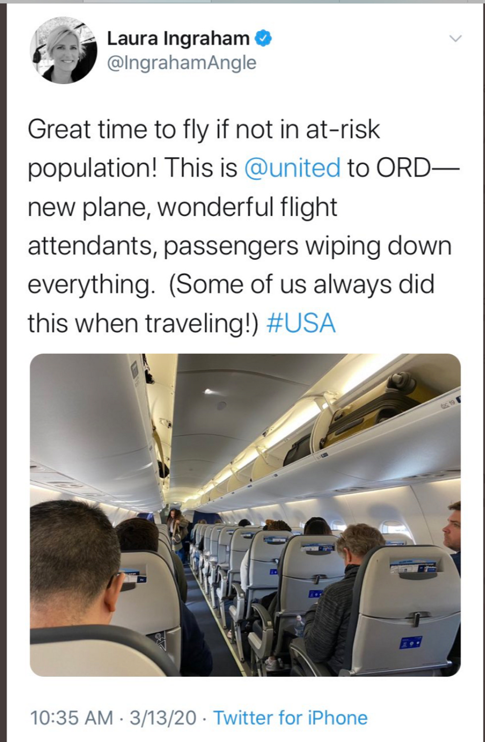 For the billionth time, it's not that you aren't “at risk" for catching the coronavirus. You're just probably not at (possible) risk for dying from it. Even the normal flu sucks, and there's at least a vaccine that helps prevent its spread. You can also carry the coronavirus and infect at-risk people. Ingraham really thought some disinfectant wipes would protect her on a sealed plane with recycled air where she's never not within six inches of someone else.