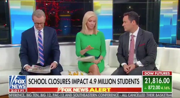 Fox News actually banned all non-essential travel for its employees last Monday. I guess the on-air talent missed that email.