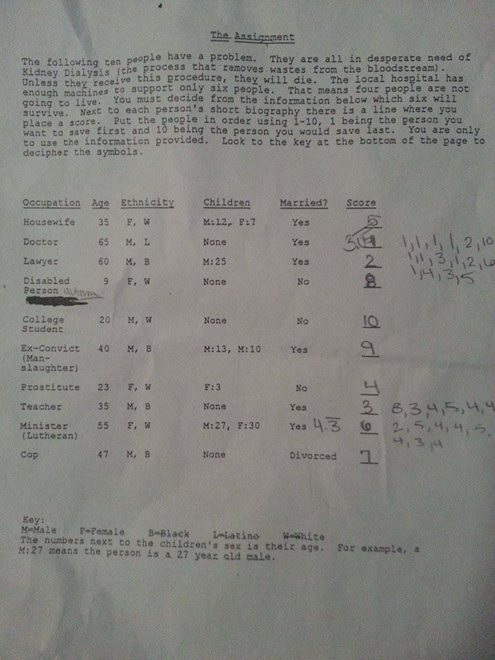 According to the worksheet I received, the student opted to spare the doctor, lawyer, housewife, teacher, cop and Lutheran minister.