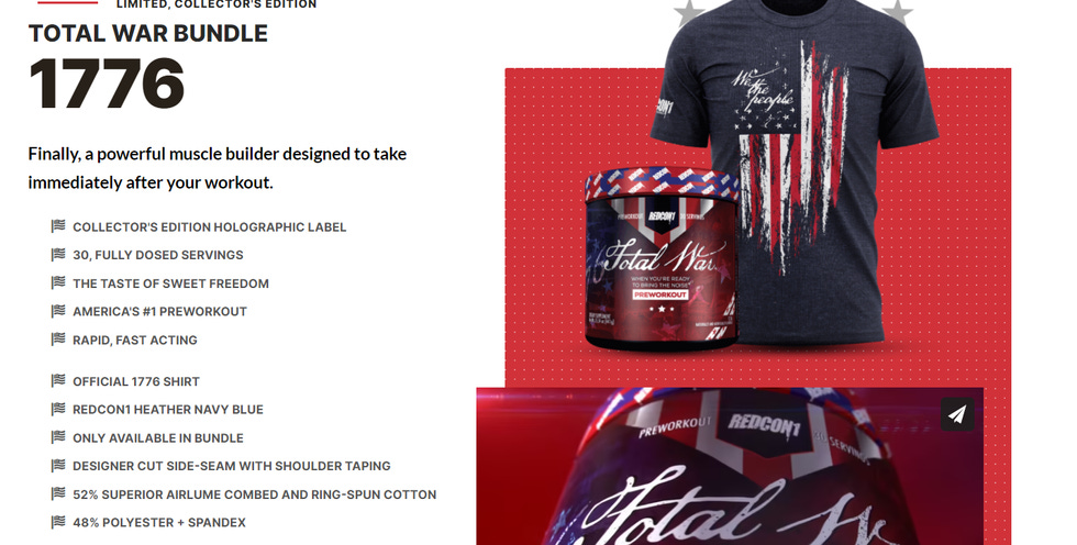 Is there are also something called TOTAL WAR BUNDLE 1776, which includes "Official 1776 Shirt" and a big can of pre-workout powder called TOTAL WAR that literally says it's for "WHEN YOU'RE READY TO BRING THE NOISE"? It says it tastes like "the taste of sweet freedom"!