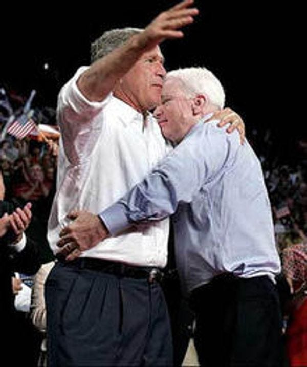 That whole Barbara Bush fetus jar thing from yesterday really screwed up her son's mind, so much so that in 2008, during the buildup to the general election, he told former British Prime Minister Gordon Brown and a group of dignitaries he would have endorsed Barack Obama if Obama's people had asked him. And that he "probably won’t even vote for" McCain. Is this because Bush was mad at McCain for having the GALL to compete for the Republican nomination in 2000? Or is it because the man's mental capacities were permanently damaged by the trauma of his mother having shoved that fetus jar in his face -- and the years of subsequent alcohol addiction -- and was genuinely confused to which party he belonged?