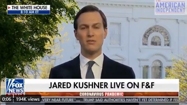 So anyway, here's Jared Kushner, crown prince of the coronavirus fuckups, to tell us all on "Fox & Friends" what a smashing success this all is, on behalf of the 59,692 people who have died so far.