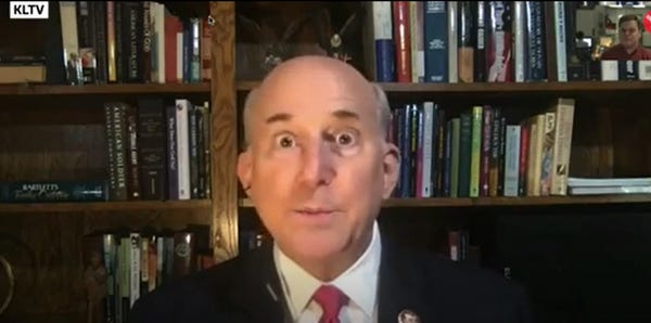 That's right, it's everyone's favorite Gomer, the Nincompoop of Nacogdoches, America's Dumbest Congressman Louie Gohmert. And although Flynn is getting all the headlines, let's not ignore the fact that it's qualitatively worse for a member of the House of Representatives to be flogging conspiracies than a retired general and a wacko lawyer who is (still! inexplicably!) a member of the bar in good standing.