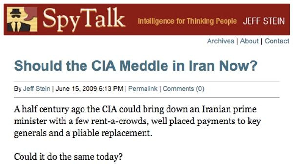 No. No. No. Stop it. No. None of that. Stop. The CIA should not use the occasion of a "Twitter Revolution" to secretly attempt regime change in Iran. That's just nuts. No. Please just stop this. C'mon. The rest of the article explains how this would be an idiotic and terrible idea, so why even? Stop. No CIA. No CIA meddling. No. Stop. Stop it. [ CQ/Spy Talk ]