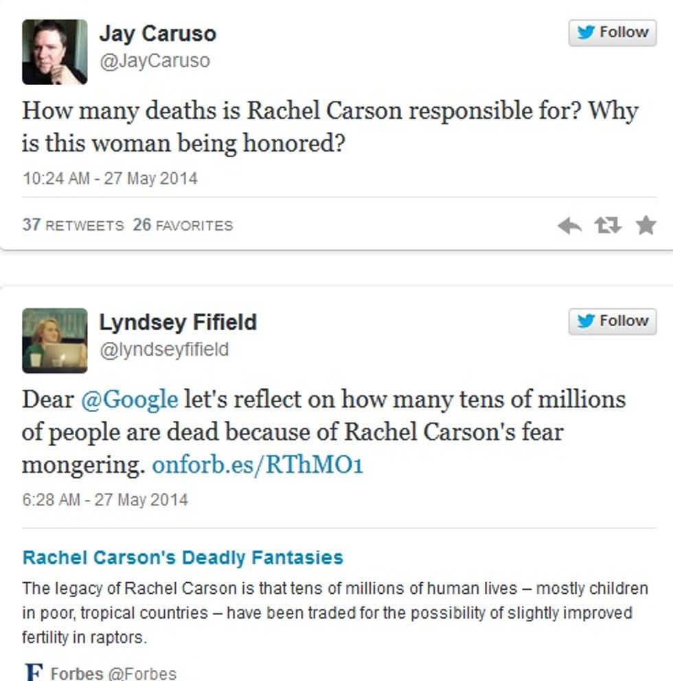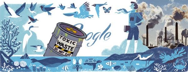 Google has really angered the Wingnuttospere this week. First off, on Monday, the search engine failed to put up a special doodle for Memorial Day, because Google Hates America -- actually, the page did mark the day with an American flag and yellow ribbon icon, but they were too small and didn't go up at midnight like they should have, but later in the day.* Then Tuesday, Google drew the wrath of all nine fulltime staffers of Twitchy by honoring Rachel Carson on what would have been her 107th birthday. This tribute to a known environmentalist sparked a Twitch-Fit, because of course by writing Silent Spring, a book that eventually led to the banning of DDT, Rachel Carson personally murdered millions: