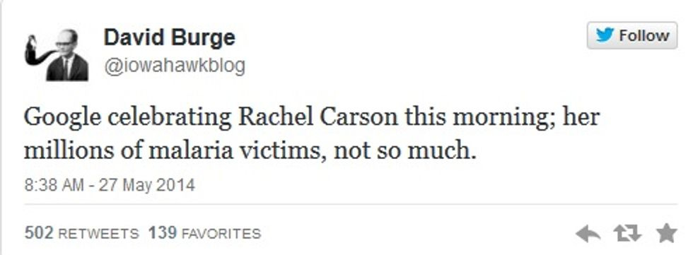 Did we say Mengele? Nah, much worse! If it hadn't been for Silent Spring, no one ever would have had a problem with DDT, and we'd have eradicated malaria, maybe, and there never would have been an environmental movement or an Earth Day, and there'd be no EPA and everyone would be RICH. This is quite literally the most concern for African children you'll ever see on Twitchy.