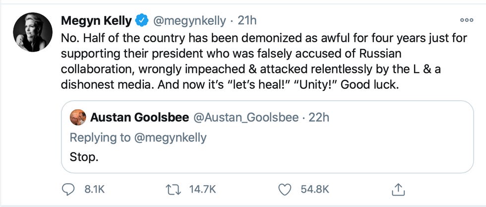 It's a flat-out lie that people who voted for Trump were “unfairly attacked relentlessly." They've been catered to with New York Times profiles and Democratic outreach over the past four years. The standard position was that Trump's a con man who exploited his white working class supporters' legitimate economic concerns. Interestingly, the rare times Trump supporters were mocked outright, the culprits were Lincoln Project types, not actual liberals, whose hearts can't stop with the bleeding.