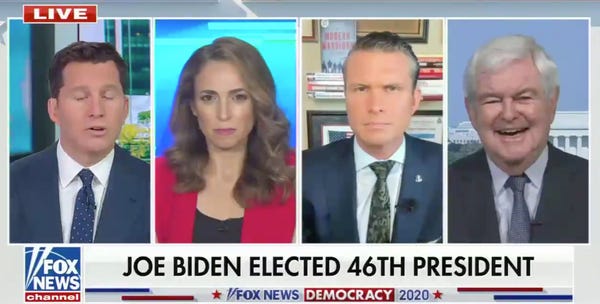During his victory speech Saturday, President-Elect Joe Biden offered a message of unity and reconciliation with Trump supporters. That's what he should do. He's the bigger person, unlike the petty Black man writing this post. Republicans are responding true to form, though, and slapping away Biden's extended hand of friendship. Sunday, on Fox News, Newt Gingrich burned a whole tree's worth of olive branches when asked about Biden's speech.