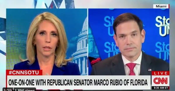 Host Dana Bash asked Rubio how he can square his hypocrisy at requesting disaster relief now with his previous objections to other states' disaster relief requests. Rubio tried to bullshit an answer that would sound good to conservatives, but Bash corrected him as he went along.