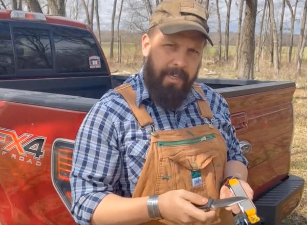 MAGA Pastor Jarrin Jackson announced his plans to run for state Senate in Oklahoma this week, complete with an extremely normal and well-adjusted seeming campaign ad. Standing in front of a pick-up-truck, donning his jazziest Osh Kosh B'Goshes, Jackson menacingly sharpens a knife and prattles on about how he wants to be "unleashed" for the purposes of fighting a war against communism.